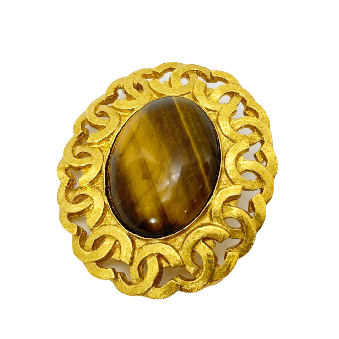 CHANEL シャネル ヴィンテージブローチ タイガーアイ ココマーク 楕円 95A ゴールド